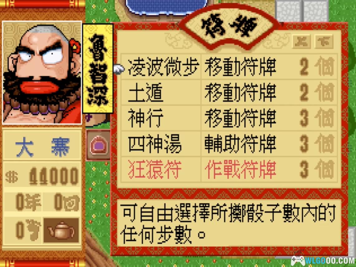 - 游戏方式:游戏主要通过投掷随机的点数,操控角色在棋盘上前进,在分叉路口可以选择前进方向,在遇到空地的时候可以选择占有放置产业,前进时还会发生大量的固定事件点和随机事件,让游戏充满变数,一边要积累自己的势力,壮大自己的武将,还要去妨害对手,最终金钱最多的玩家将获得胜利。
