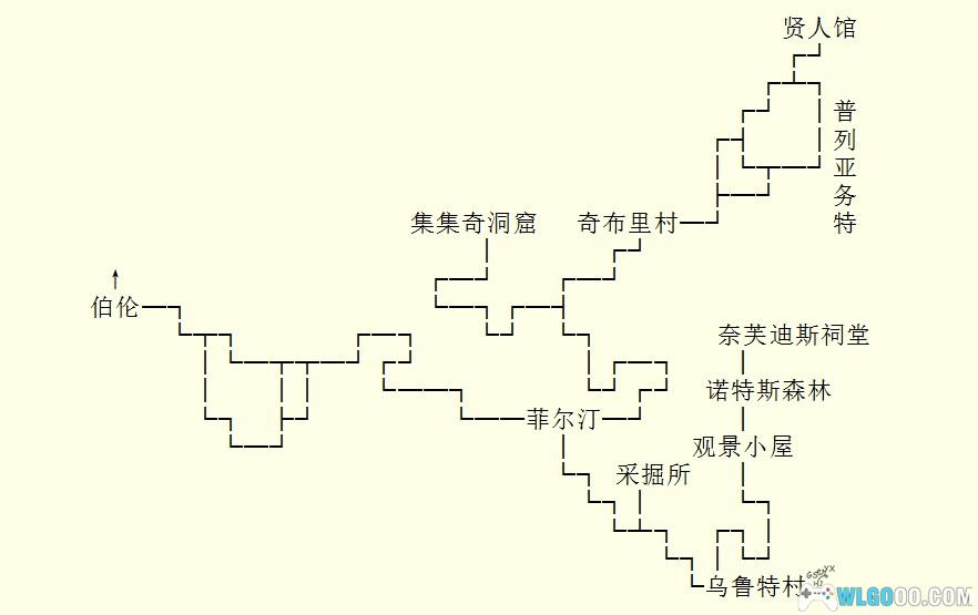 拜别贤者“狄那凯”后,回到“奇布里村”,来到“雪侬”家中(左上屋)受到“雪侬”一家人的热情招待后,便再度踏上旅程;经过“菲尔凸一路走到了“伯伦”。