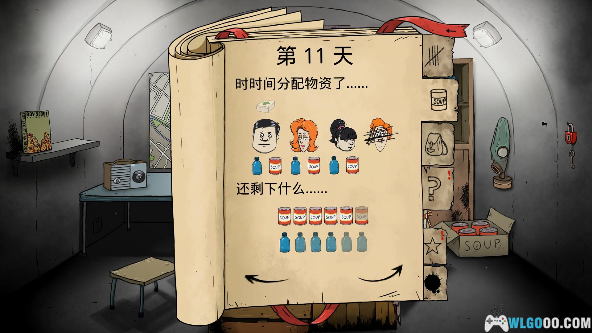 - 避难所生存管理:进入避难所后,游戏转为回合制资源管理与叙事驱动冒险。玩家需每日分配口粮,决定家人的行动,并应对随机触发的突变事件。每个抉择都会影响家庭成员的健康、心理状态及后续剧情分支。