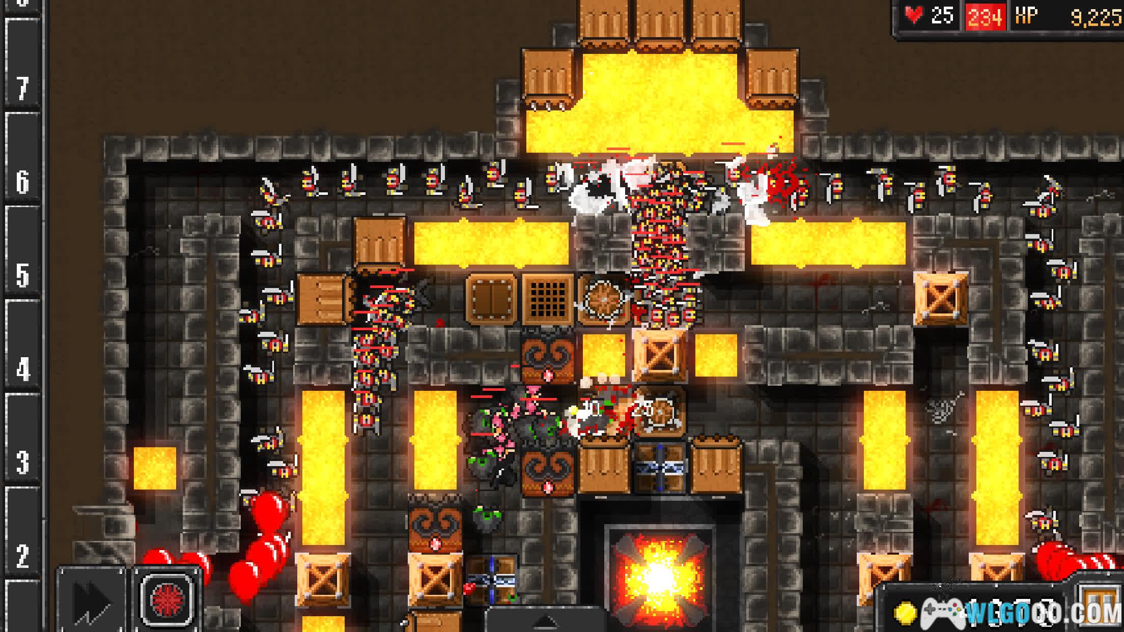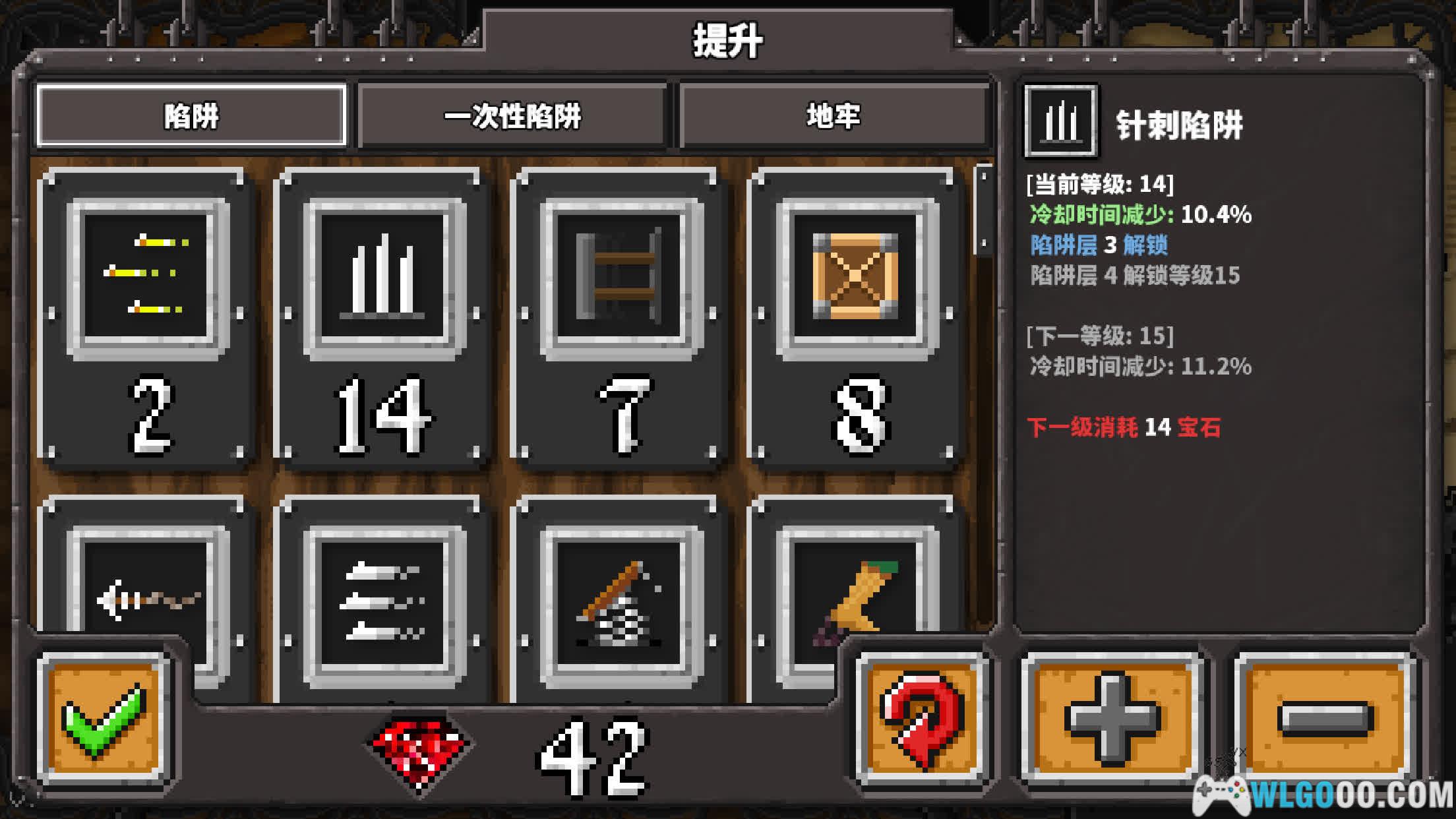 - 陷阱升级:通过关卡后获得的钻石,可以永久提升陷阱的强度和解锁新能力。游戏提供了26种独特的陷阱,大部分可进行3层升级。