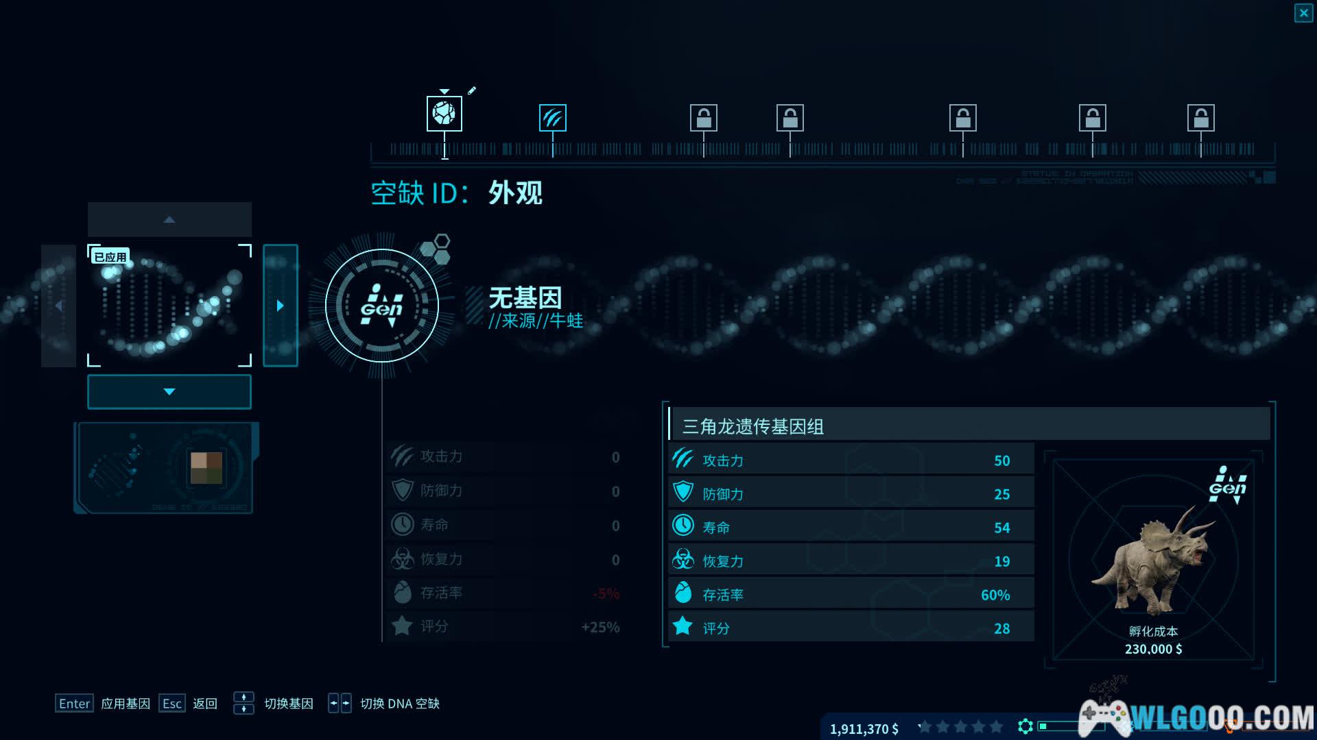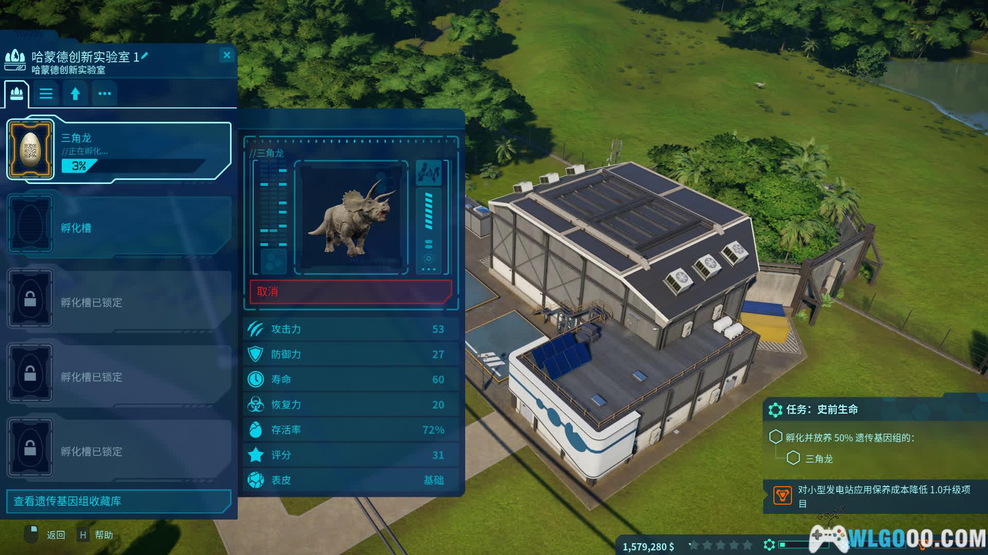 - 恐龙培育:游戏的核心乐趣之一是通过挖掘化石、提取恐龙DNA来孵化恐龙。通过基因编辑创造拥有独特外观、行为和特性的恐龙。