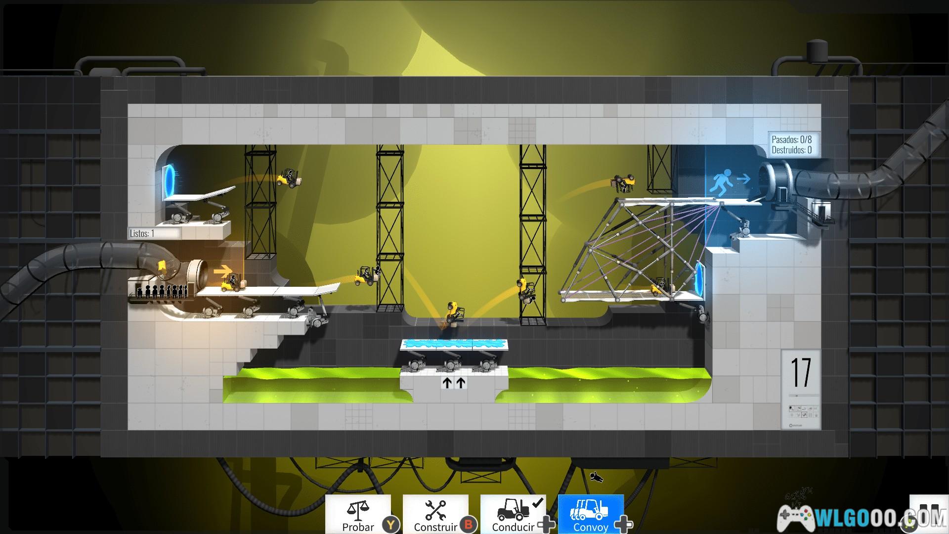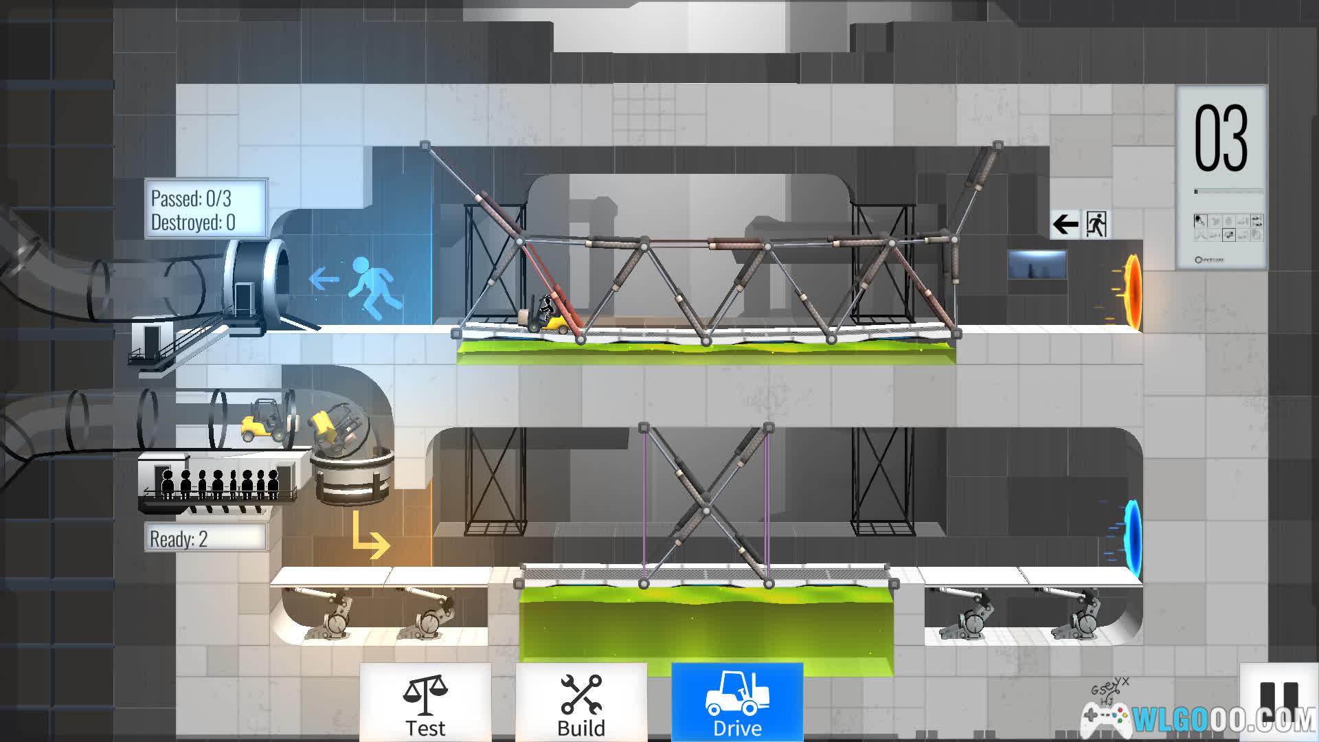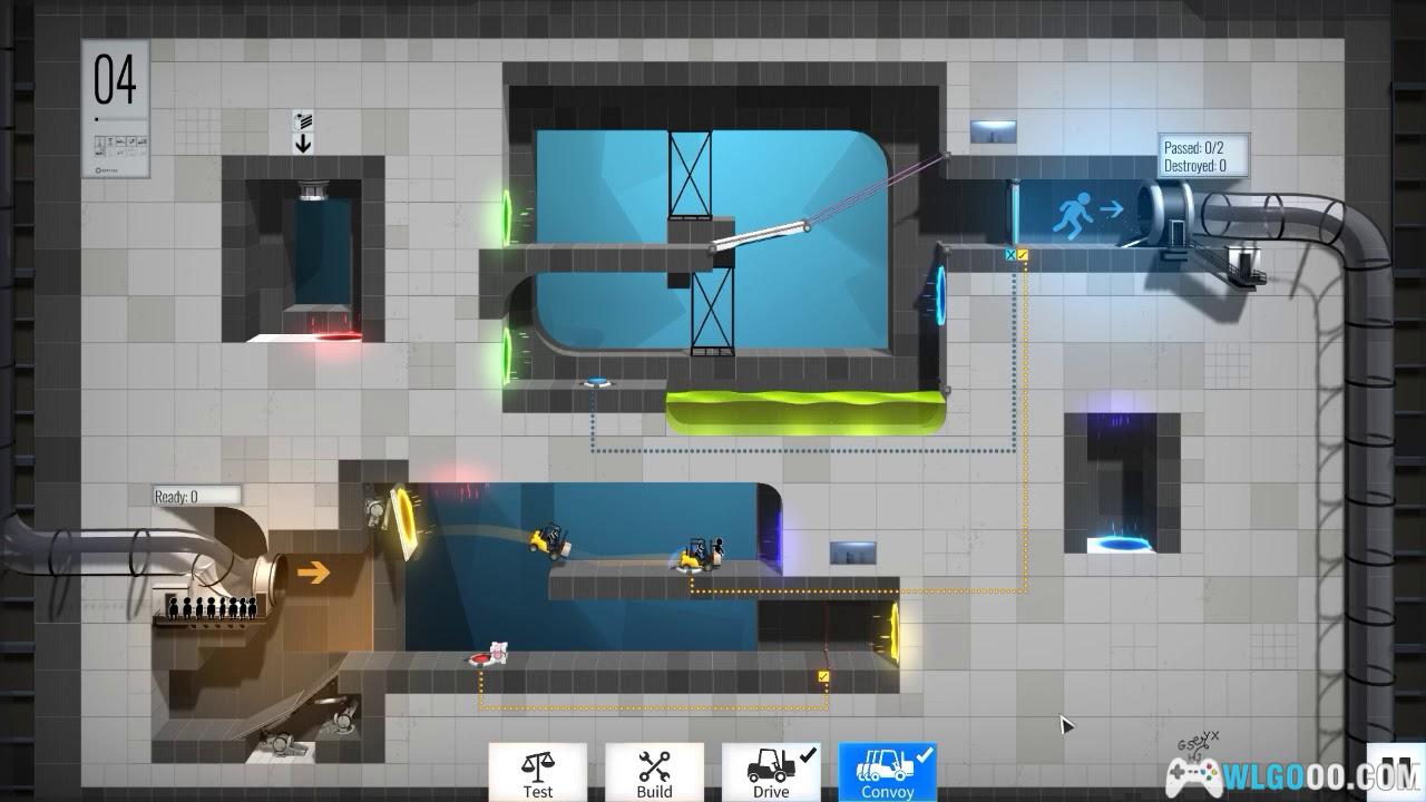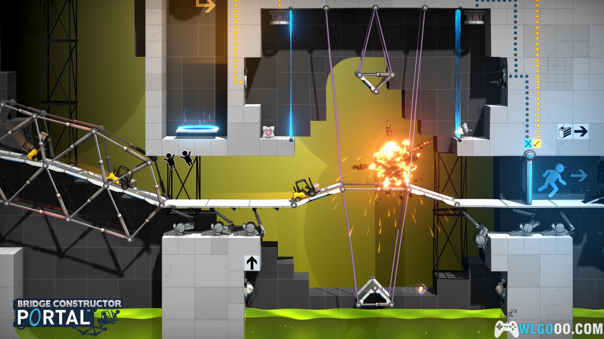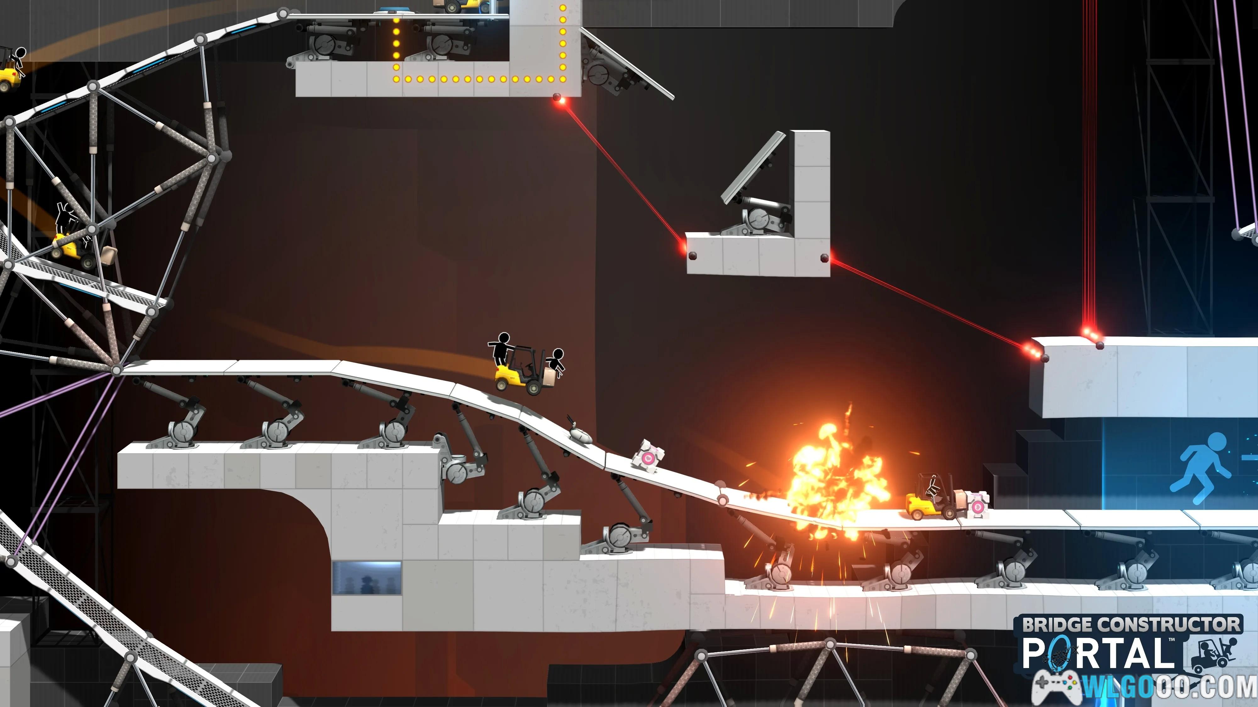 游戏将《传送门》系列的空间跳跃机制与《桥梁建造师》的工程模拟深度结合,玩家需在光圈科技实验室中设计桥梁,利用传送门、凝胶、炮塔等元素,引导车辆安全通过充满机关的测试室。