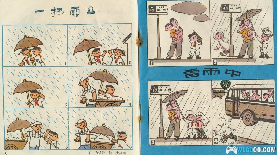这两幅漫画我到现在还是有印象的,雨天,都跟伞,避雨有关。《一把雨伞》担心拉车叔叔车上的粮袋被雨淋,把自己的伞盖在车上。《雷雨中》车站等车,阿姨抱着小孩儿,下起雨来,小男孩儿把自己的雨伞给了阿姨,另一个小伙伴过来用自己的雨衣帮小男孩儿遮挡,等公交车来了,大家各奔东西。