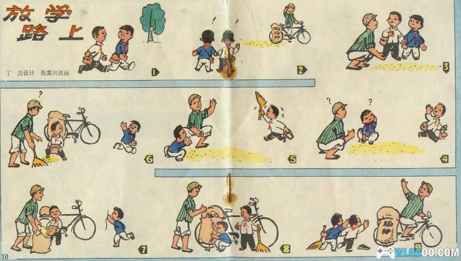 《放学路上》哥儿俩放学路上看见了一位骑自行车的叔叔正在马路上一筹莫展,原来他运送的稻种袋子破了,撒了一地的稻种。其中一个男孩儿跑开,一会儿回来拿着簸箕和扫帚,另一个男孩儿见状也马上离开,一会儿拿来了针和线,三个人一起把稻种收拾好并缝好了袋子,叔叔向他俩道谢双方告别。