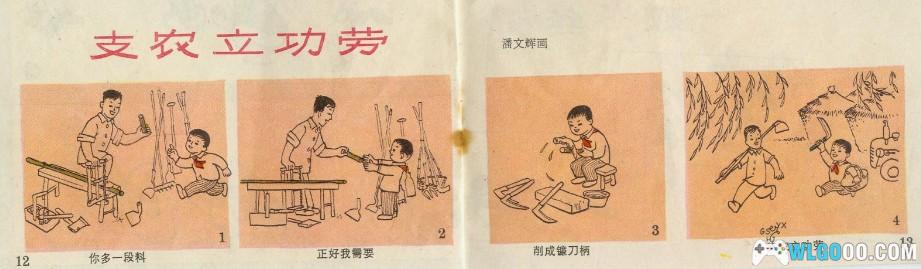 《支农立功劳》父亲正在做木工活,锯下来的多余的木料正好儿子有用,将它做成了镰刀柄,这样下地劳动更带劲儿。