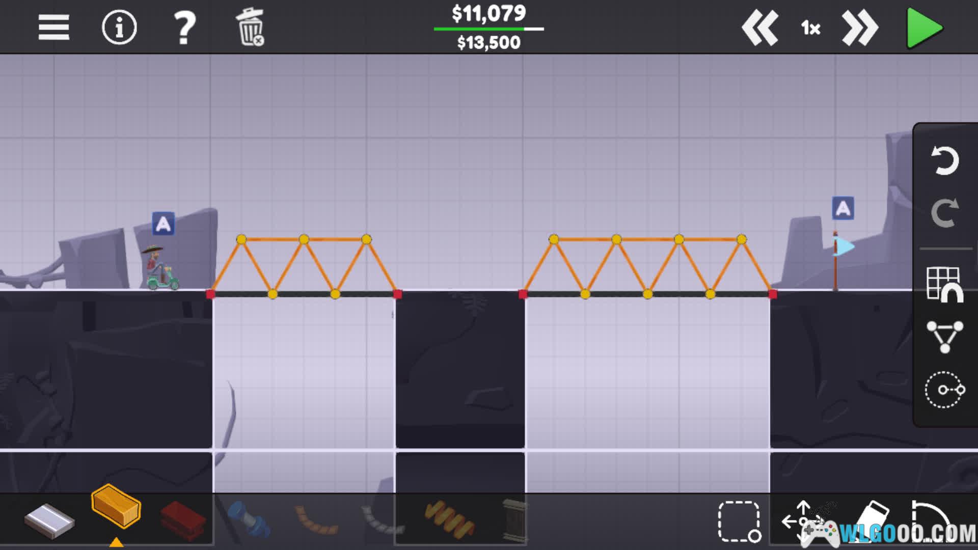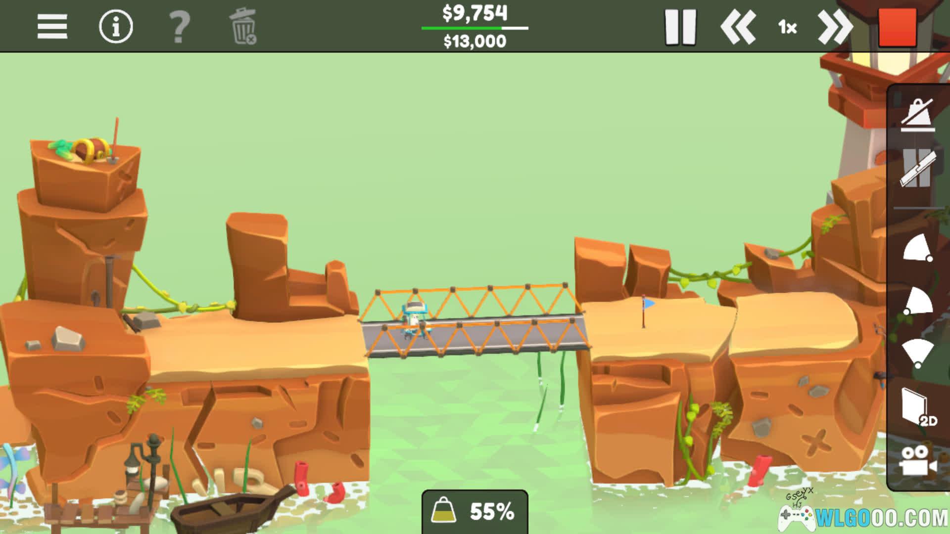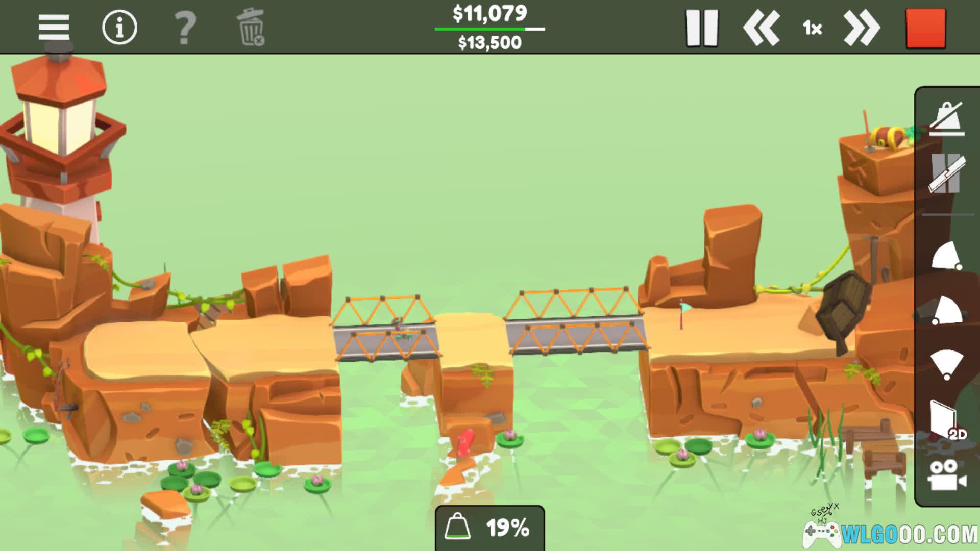 - 桥梁建造:每一关的材料预算都是有限的,玩家需要在材料用光之前完成工程的搭建,像积木组合链接各个部件,让他们能够稳定得维持运行。