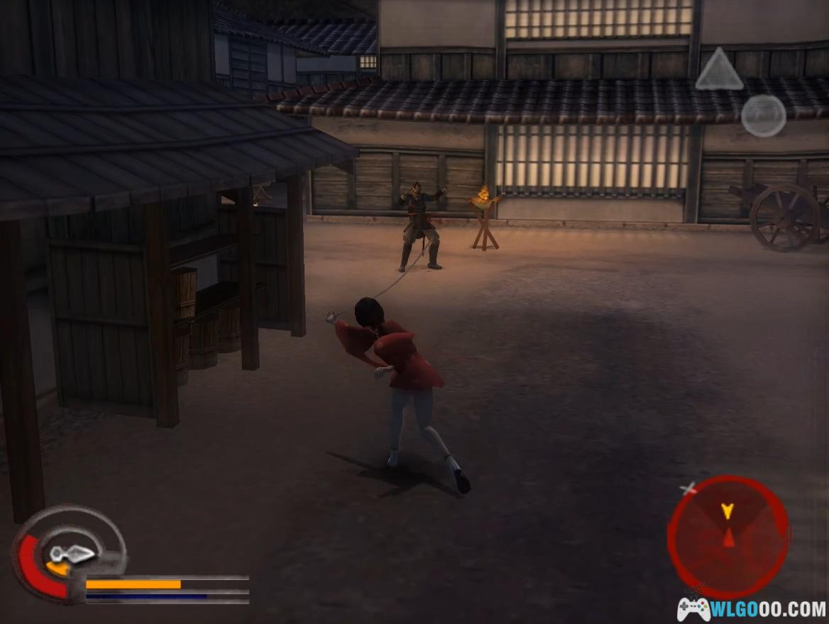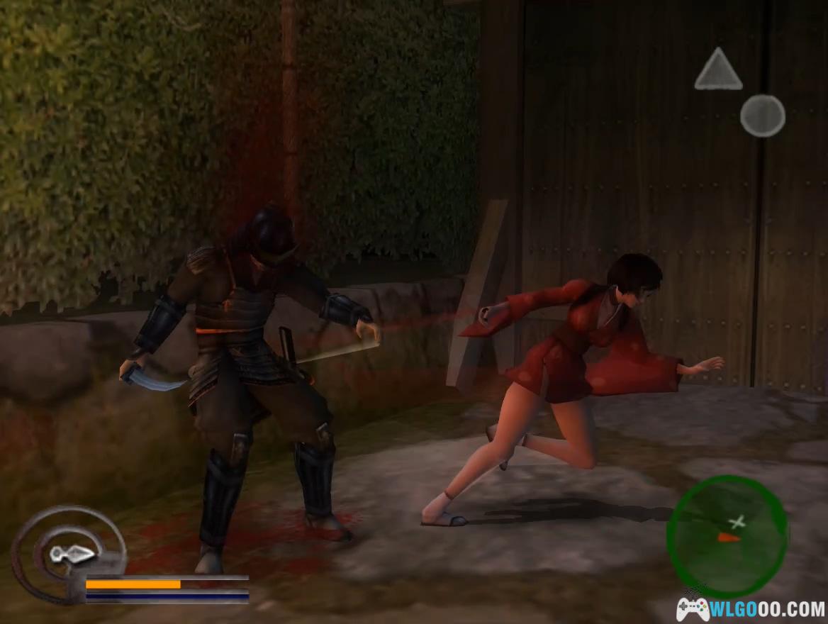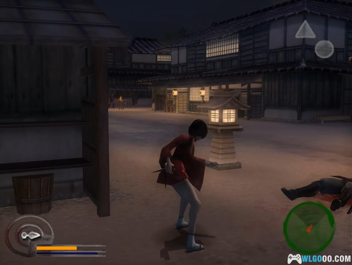 按住R2钻过地道到达室内,利用木箱跳到天花板上,找到有记号的墙壁处向上跳抵达屋顶。大桥区域不推荐使用水循技能,用瞬杀即可应对。杀掉守门的士兵后,用取得的钥匙开门。过场动画后,从明美那里获得吹箭,按Select键装备,需忍杀右边巡逻的士兵(不可用瞬杀),在屏风之间按L2键瞄准官员的头部发射吹箭,随后对付5名杂兵,战斗难度较低。