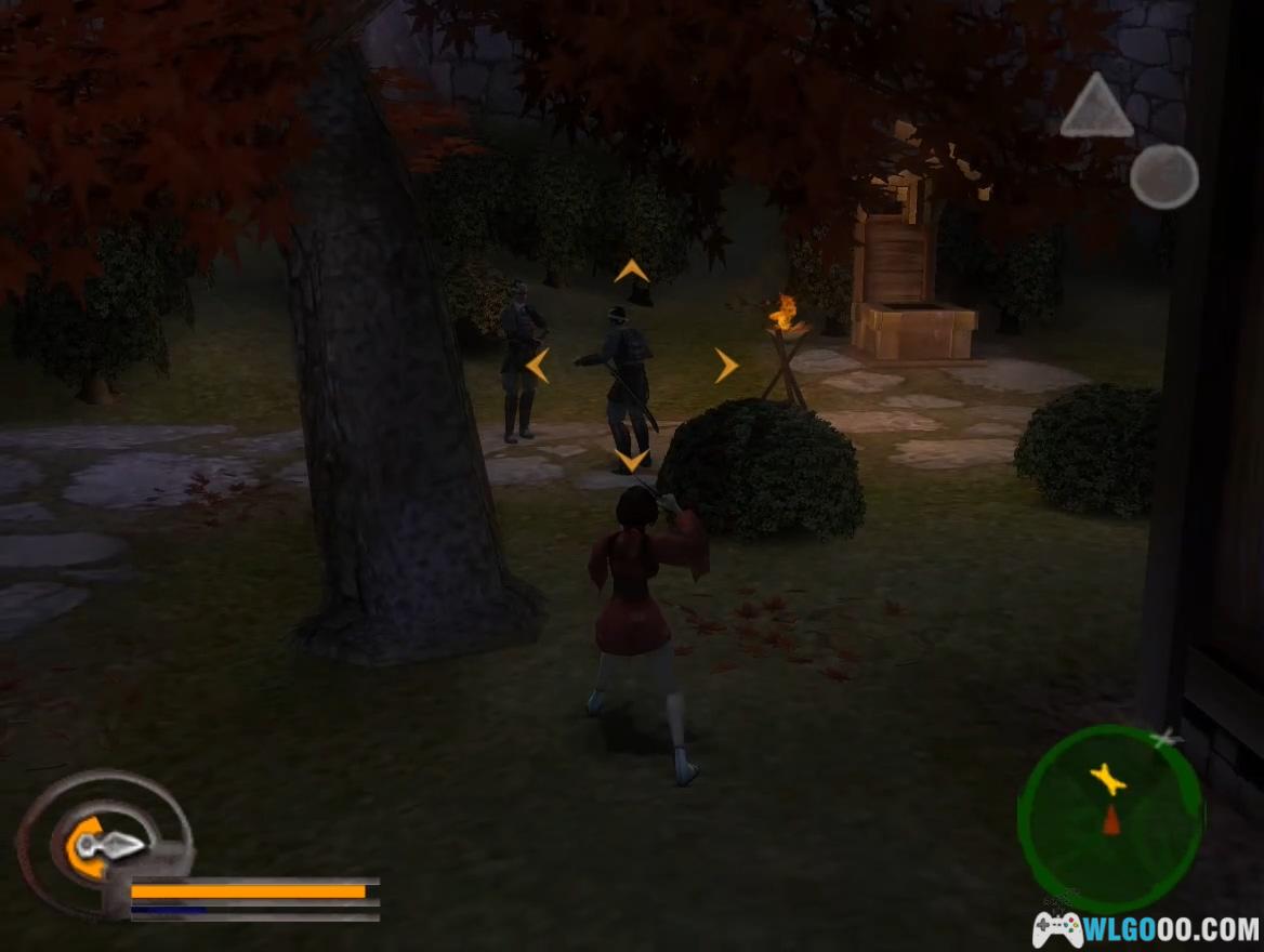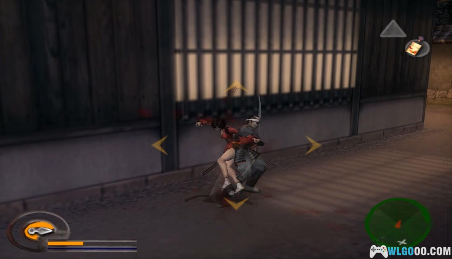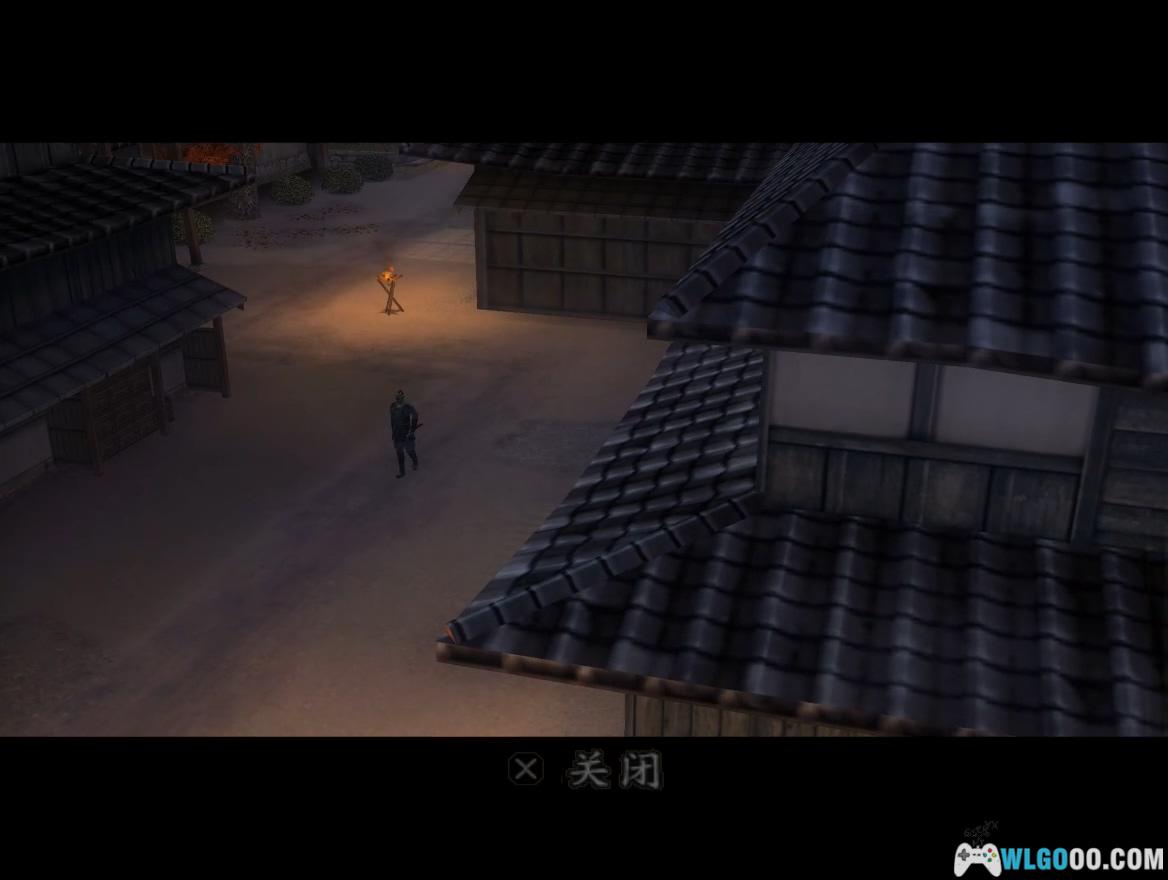 按住R2钻过地道到达室内,利用木箱跳到天花板上,找到有记号的墙壁处向上跳抵达屋顶。大桥区域不推荐使用水循技能,用瞬杀即可应对。杀掉守门的士兵后,用取得的钥匙开门。过场动画后,从明美那里获得吹箭,按Select键装备,需忍杀右边巡逻的士兵(不可用瞬杀),在屏风之间按L2键瞄准官员的头部发射吹箭,随后对付5名杂兵,战斗难度较低。