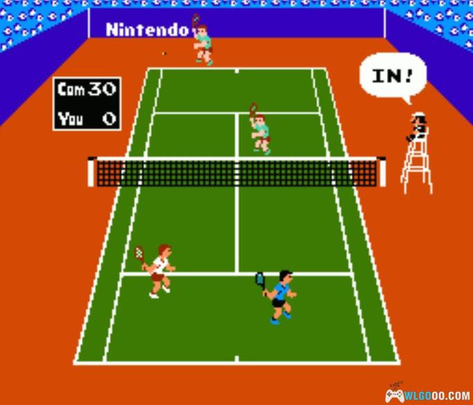 另一个游戏是网球,看到中间的裁判还是马里奥,很负责任的盯着球的去向,做出公正的判断。我们双打的时候,我总是瞎按十字键让自己操作的球手乱转,说是要迷惑电脑对手,偶尔还要跑到裁判椅下面抡几下球拍来表达上一把输球的抱怨。
