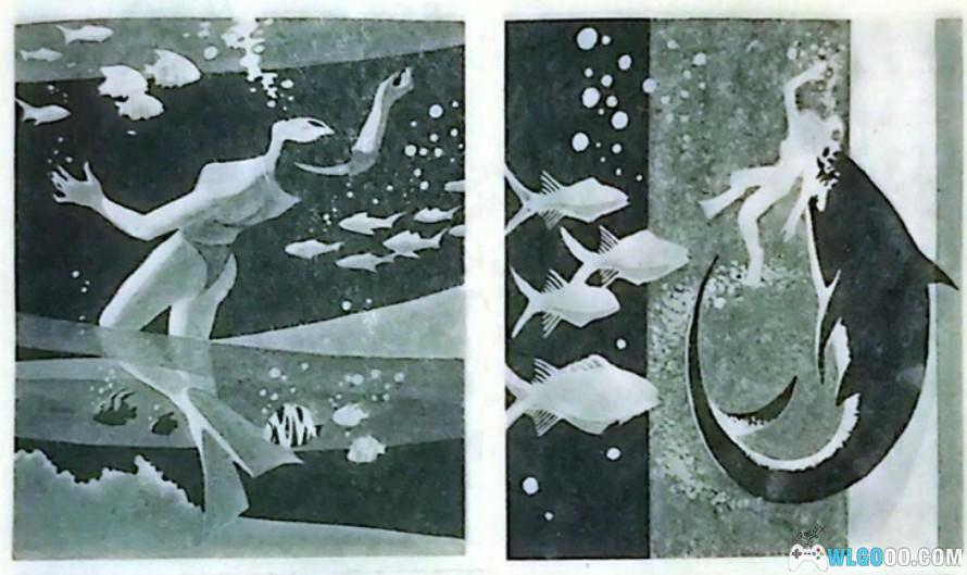 突然间,海底出现了一个庞大的黑影——海女们断定是一条可怕的大鲨鱼,立即停止水下作业,迅速游出水面。