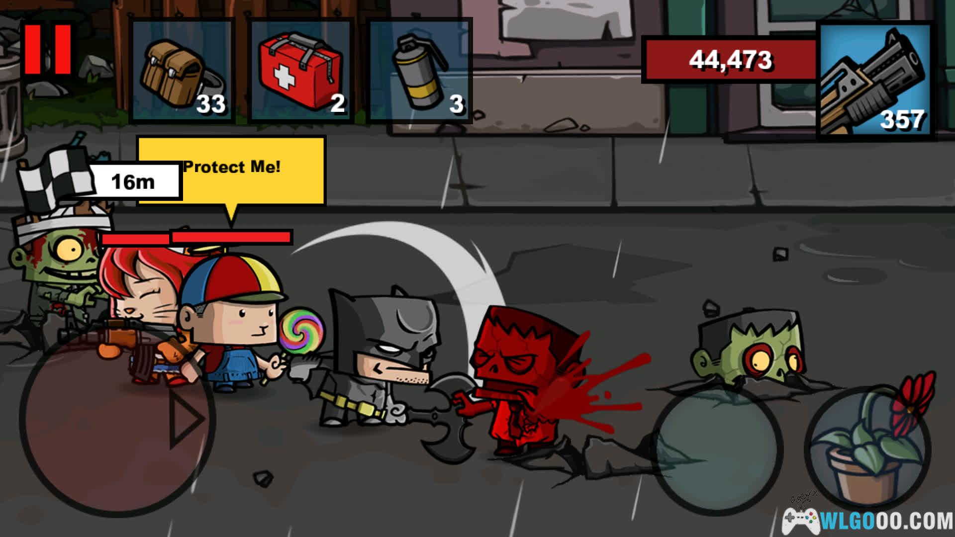 - 卡通风格:采用夸张的像素画风与幽默弹幕效果,虽然是僵尸题材,但整体风格轻松搞笑。还有来自各种其他作品的知名角色可用(比如街霸,蝙蝠侠)。
