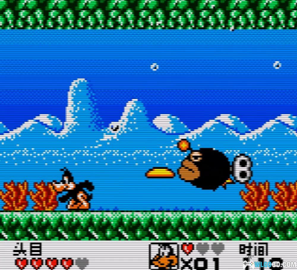 面对小BOSS约塞米蒂·萨姆。需要击中他3次才能击败他。最好的办法是让他呆在顶部的台阶上,同时跳起来用飞盘攻击他。但要小心他发射的子弹。击败萨姆将为你赢得5000分。向右离开。
