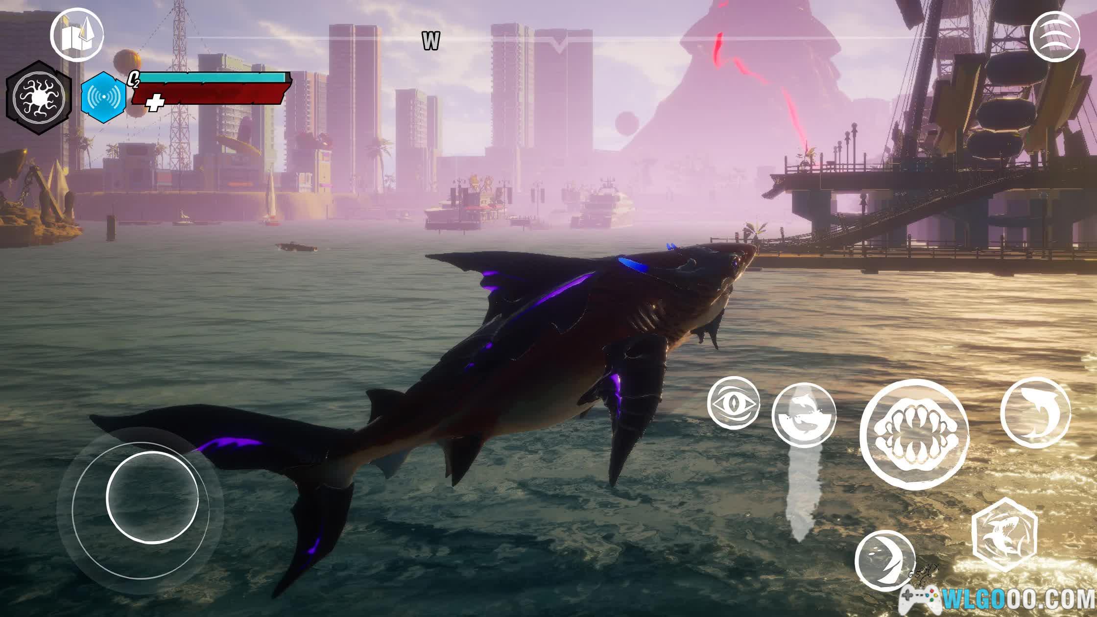 - 掠食成长:玩家扮演一条鲨鱼,在开放式海域中自由游动、狩猎与探索。通过吞噬鱼类、人类与其他海洋生物获取营养点数,用于提升属性与解锁新能力。