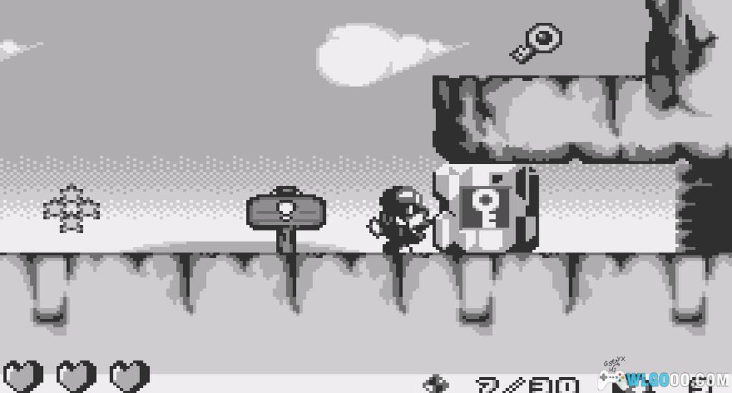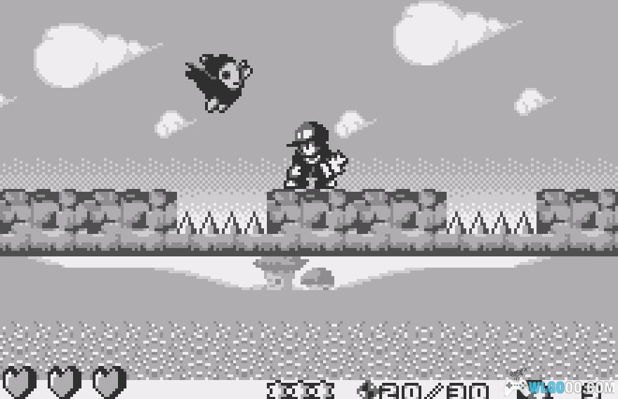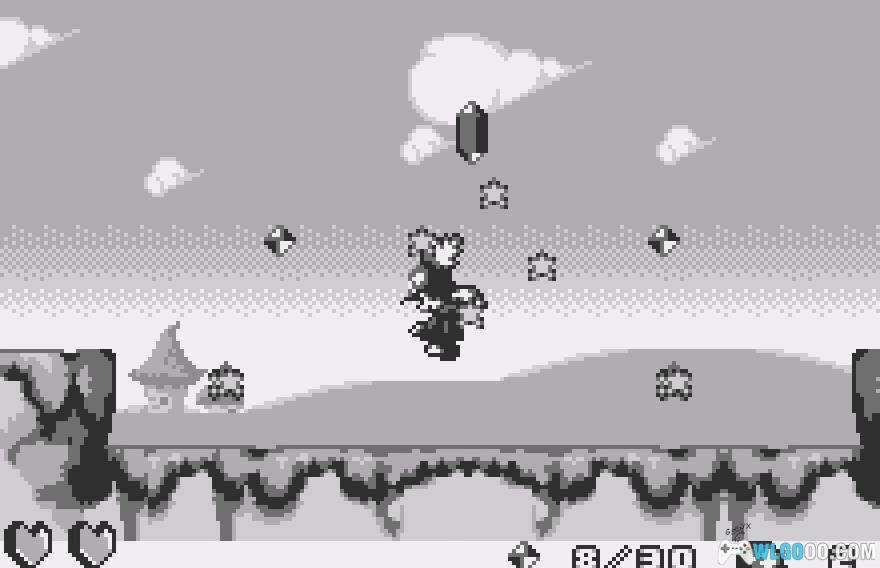 在这个区域,向东走并抓住你遇到的飞行敌人。然后,向西返回并跳到你上方的平台低处。跳到它的顶部,然后向东跳并滑翔。落到3颗宝石排成的线上(10)和一颗心。