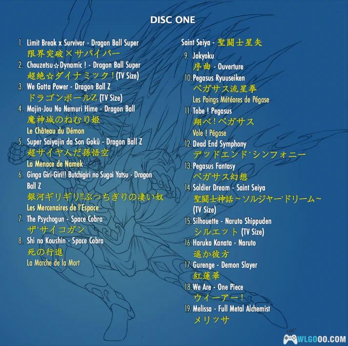 共 36 曲,相比 2022 年版本,新增了龙珠超、火影忍者、鬼灭之刃、海贼王、钢之炼金术师等热门少年动画的主题曲。不仅修正了原版音质限制,还补全了作曲家手稿中未公开的乐段,将圣斗士北欧篇完整收录。