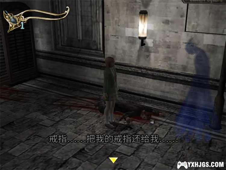 现在主角要做的是去解脱这个灵魂。它要的是枚戒指,一般灵魂所要求的物体都会散落在灵魂肉身的附近,所以我们检查电话厅。发现门已经可以打开了,从里面搜索出戒指。通过游戏的介绍了解到把戒指放回戒指盒里,灵魂会获得解脱。当玩家满足灵魂的愿望后,通常灵魂会留下一个物品或道具作为回报。这个灵魂在他的尸体附近留下一个SIGIL STONE。沿街道继续前进,发现一个狮形喷泉。玩家可以在这重装圣水和记录游戏进度。