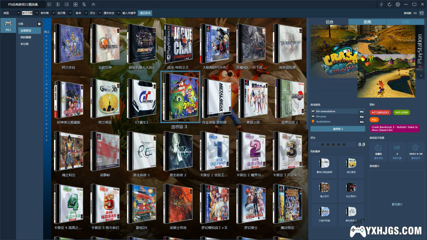 睡神林克制作,PS1精选前端整合,游戏大部分是中文汉化版本,附带图片视频预览。模拟器调试好了滤镜与美化遮罩效果,支持XBOX手柄与键鼠操作。