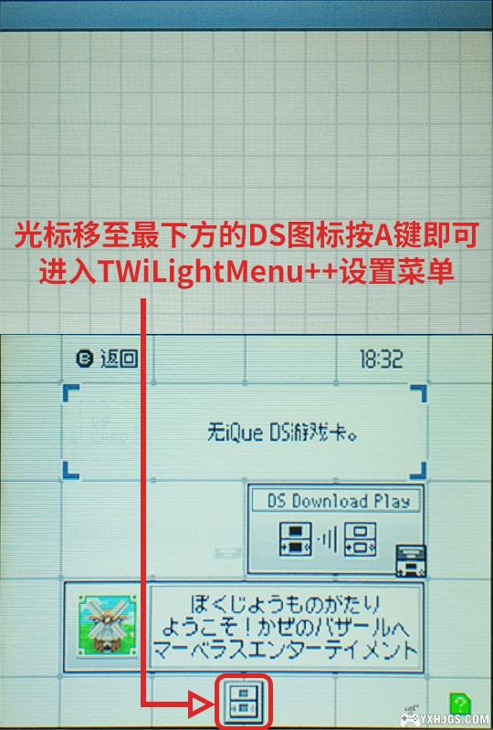 - 在TWiLight Menu++主界面按SELECT键,根据不同的设置或主题,会进入 DS经典菜单 或 TWiLight Menu++设置菜单 。如果进入的是 DS经典菜单 ,将光标移至最下面的ds图标按A键即可进入 TWiLight Menu++设置菜单 。