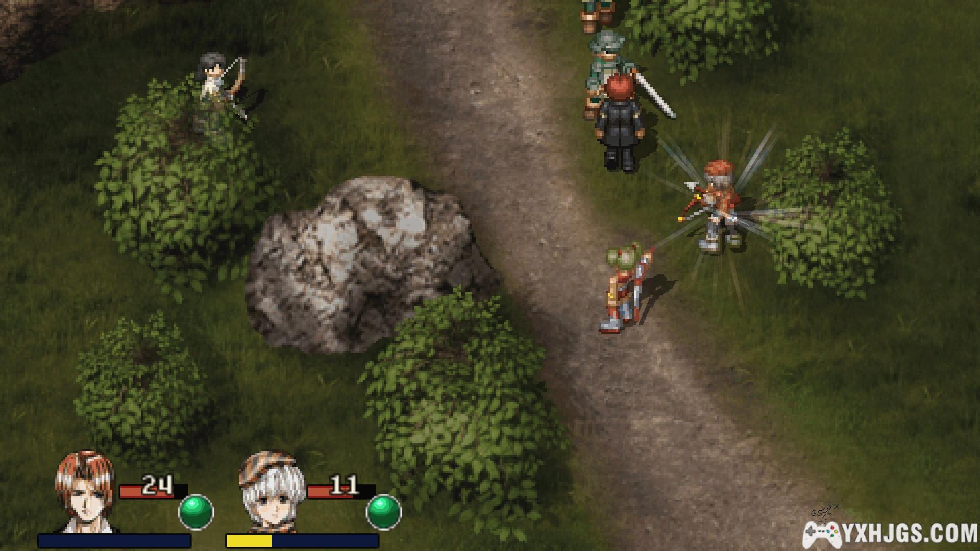 沿著向下的楼梯,来到新的区域,会引发两次剧情会话。一直向上部走,沿途草地中会不时的遇敌,可以提升人物等级,同时会随机获得物品。