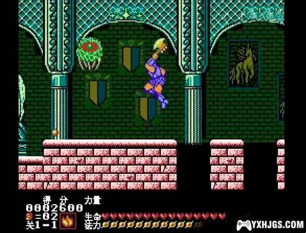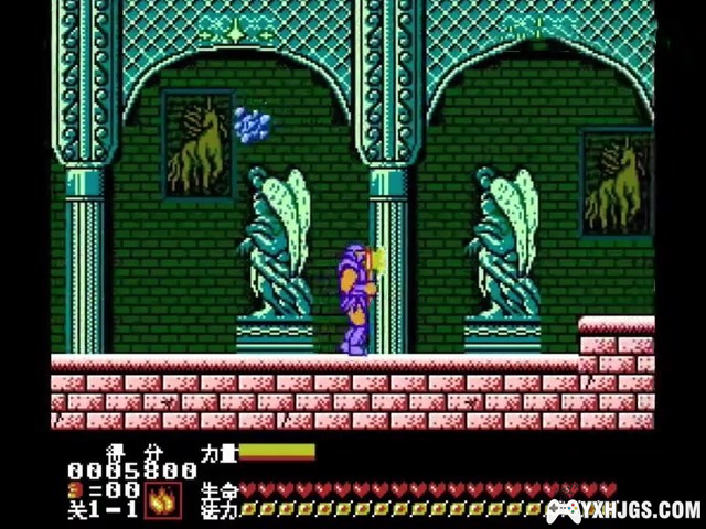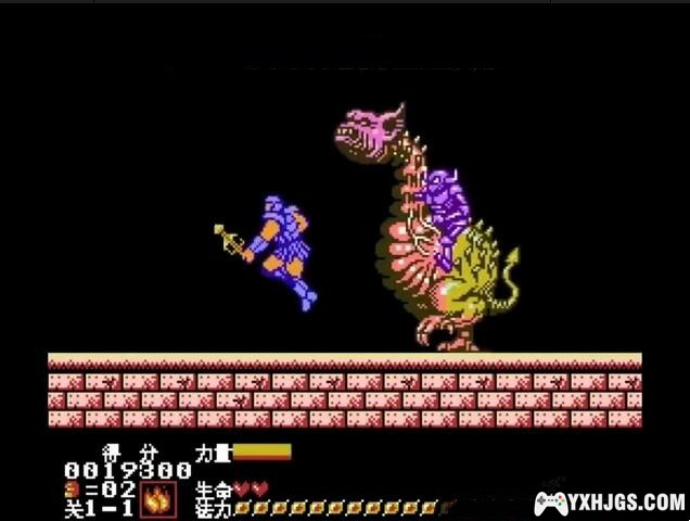 主角的武器可以升级,最高可升到3级,若主角不幸死亡,则武器就会随着降一级。最后一关迷宫走法,按照门的从左往右的顺序,场景依次为1-4-3-2-4-3-4,乱走则会迷路,会出现重复的场景,给过关带来很大的困难。