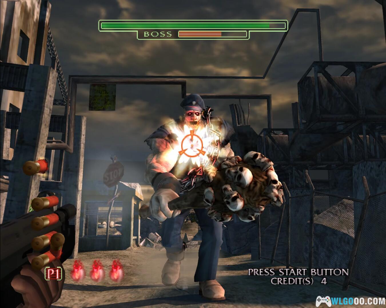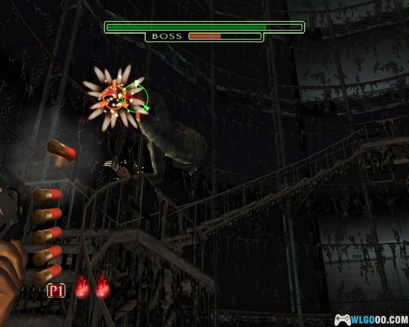 注意,《死亡之屋3》中BOSS的攻击不是一枪就能击退的。在BOSS的绿色的血槽的下方有一个橘黄色的攻击槽,你要攻击BOSS的弱点,将攻击槽内打空,这样他才不会攻击你。如果没有打空,那就惨了。打攻击槽的同时BOSS也在掉血。