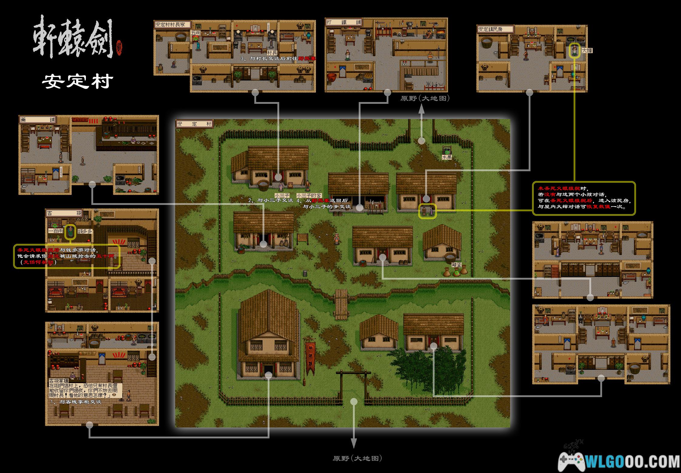 进入旁边的安定村,先与客栈老板对话,再到门口被小孩挡住的房子前与小孩对话后,小孩会让开,之后进入房子内与村长对话。之后会休息一晚,全员完全恢复。第二天众人决定捣毁野熊寨,救出小三子的父亲。野熊寨在安定村的南方。