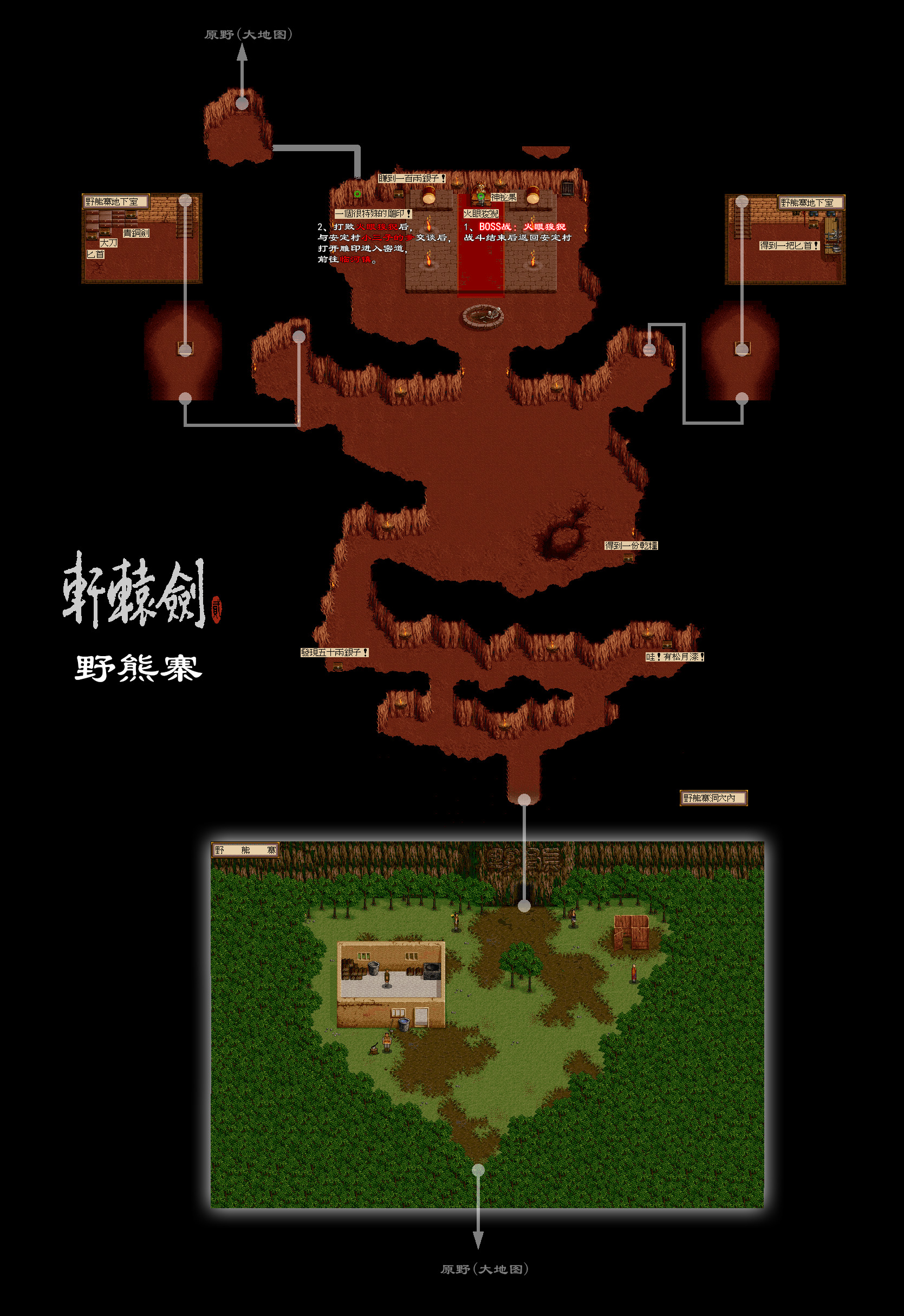 战胜后原路返回,与洞口的书生对话,再返回安定村与小三子的爹对话,返回野熊寨山洞深处。调查座椅右边墙壁的雕印,打开密道入口,离开野熊寨。
