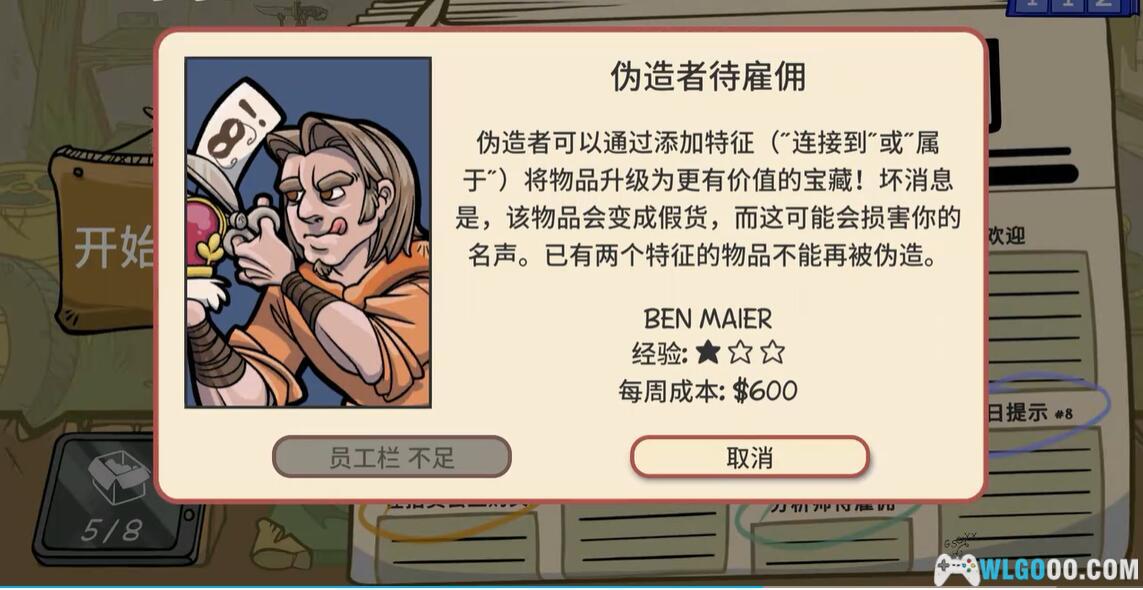 招聘第四个人是造假师,造假的条件是,名字不能有附加的东西,例如,名字为(杯子,属于up主帅哥的。)不能造假,名字为(杯子)就行。选择造假的物品跟修复的差不多,那个价格幅度,基本都是翻一倍价格。然后点击人物,查看人物信息,左上角那个信息越短就越好卖。