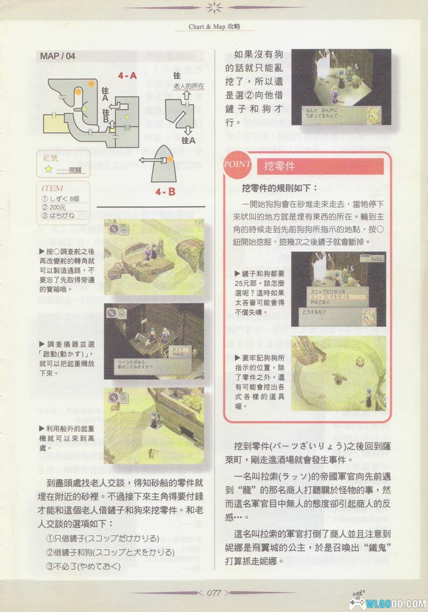 砂船零件在帝国是禁止公开贩售的,但在黑市可以找到。商人告知可以在砂船之谷(砂船の谷)找到所需的零件。来到砂船之谷,遍地都是坏掉的砂船残骸。把砂船甲板上的ハンドル往左转(往右可开启宝箱)即可进入船舱。在另一个船舱遇到带狗的老人,支付租金后,带着狗在它叫两声的地方挖掘,即可找到零件(バーツざいりょう)。