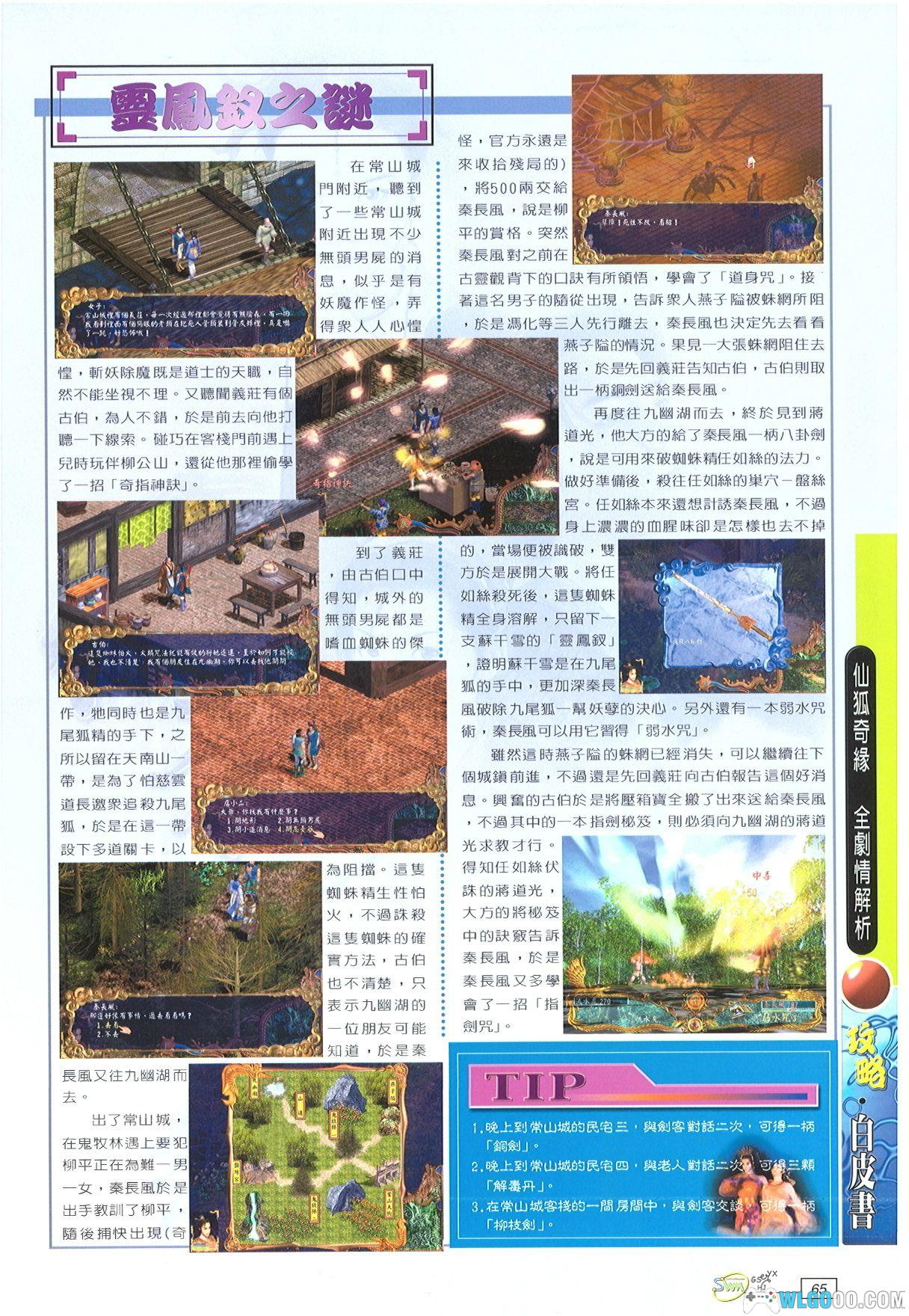 此时先回大厅,石像左边有两幅画(提示图1),背到口诀。后面到鬼牧林一打败柳平后,秦长风可练成“道身咒”。秦长风来到常山城。可到客栈前遇幼年好友柳公山,习得“奇指神诀”。可到客栈一房遇一剑客,剑客希望秦长风出去杀妖魔,给他一把“柳枝剑”。晚上可到民宅三和剑客第二次对话得到铜剑,晚上可到民宅四和老头二次对得到解毒丸。去义庄,找古伯得知有九尾狐狸的手下嗜血蜘蛛在鬼牧林为害。嗜血蜘蛛是在被九尾狐狸打败后,自愿为狐狸守关的。古伯让秦长风到九幽湖,找他的朋友帮忙。