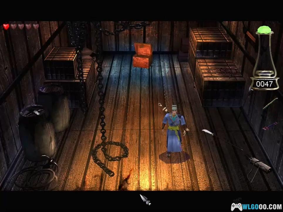 过桥走到第2个洞口,利用吊筐下到山谷,被山贼头目挡住了去路。消灭他后,一直向前来到大船旁。上船后,竟然有会动的木头人挡路。打败木头人后,一直向右走,可得到钥匙。用钥匙打开退回来的第1道铁门,两人走了进去,发现一件奇怪的事情:有无数珍宝放在一个木偶人面前。
