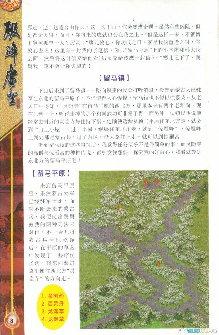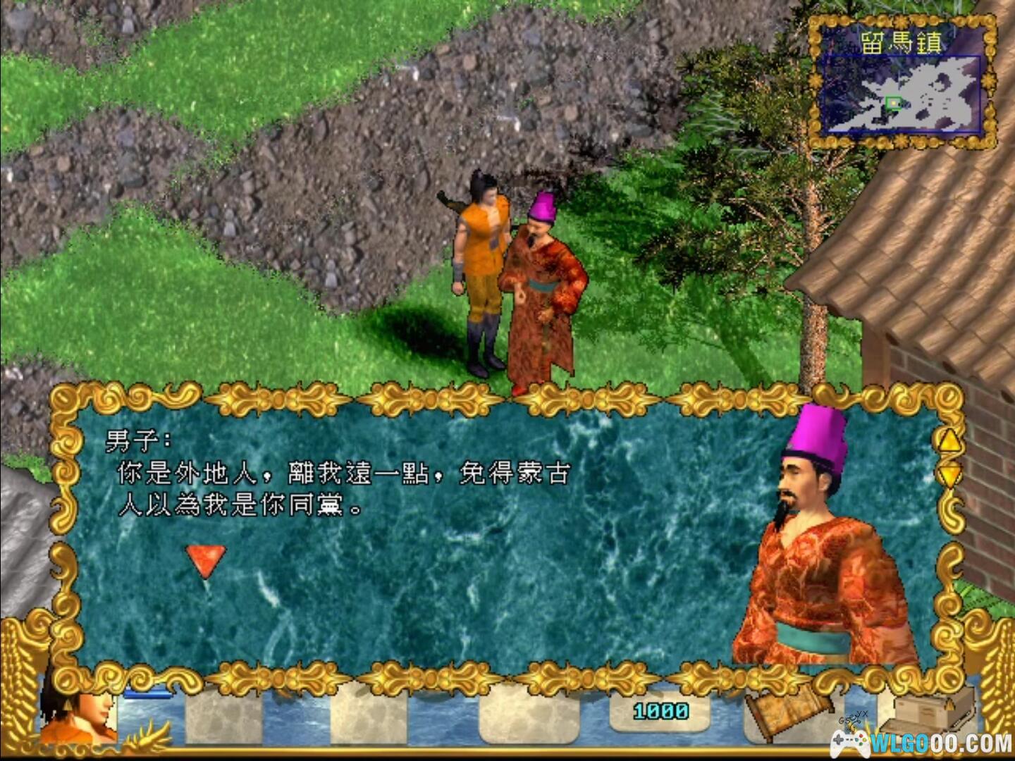 舅舅要你下山去完成一件任务:到留马平原上的一间小木屋找韩大侠,将一封信交给他,并辅助义军对抗蒙古兵。你先来到留马镇,在镇口附近的公告牌上可看到导游图,你可以用滑鼠右键点击一下下方的控制条,熟悉一下操作。买些药物,并把衣服换为盔甲,这样你的外型会威武一点。