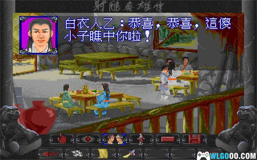 游戏开始时,郭靖出现在小食店中,这时找人问问,四处走走,熟悉一下操作后,离开店子,走到外面,会看见郭靖的小红马出了一身汉,使用汗巾,电脑会告诉你小红马的出的是血汗,回到小食店中,剩下的都是电脑的事了。