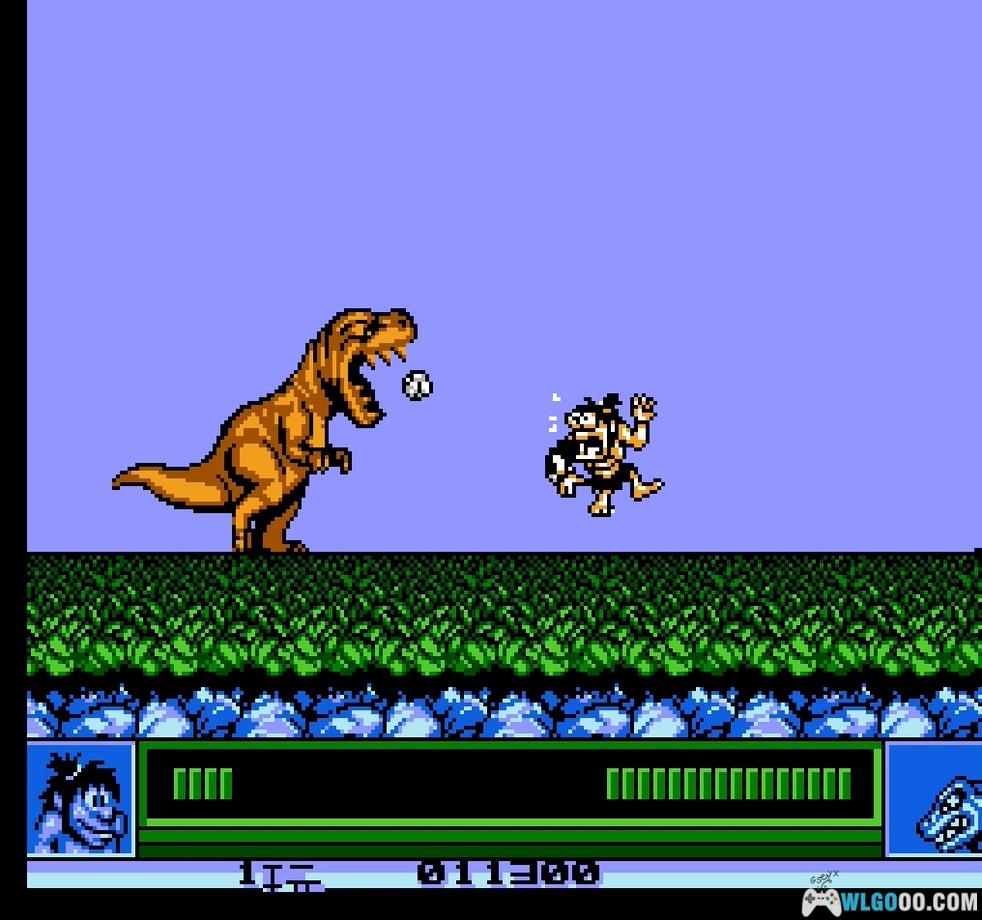 这个暴龙迷你BOSS会在屏幕上来回走动。当他走到最右边时,你需要在适当位置蹲下,避免被他吐出的岩石击中。要击败他,你需要在空中高跳时投掷武器,击中他的头部。如果成功击中,他会闪白光。用石斧击中两次即可消耗他一格生命值。不知为何,他死亡时会爆炸。