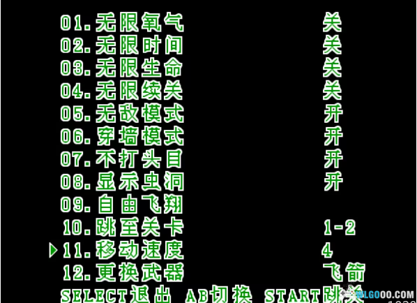 为此,本人在汉化后找出了相关HACK点,并制作成可视化切换菜单,共支持包括无限命、无敌、穿墙、跳关、加速、显示虫洞(隐藏密道)在内的12个作弊项目,具体见下面的截图。