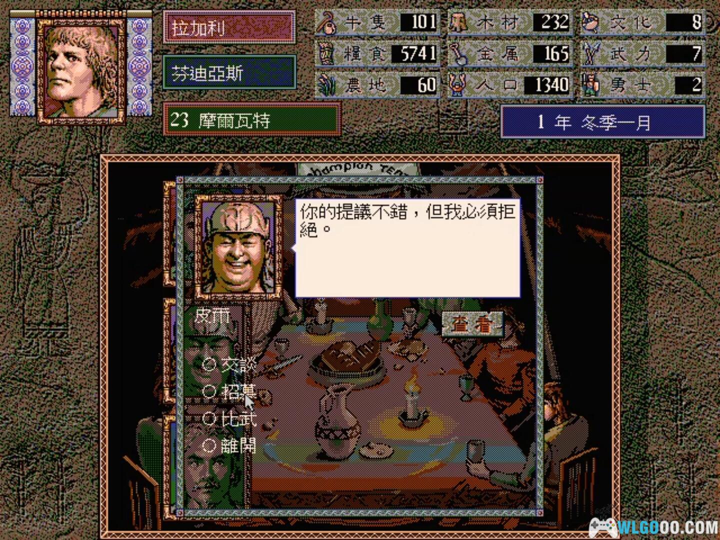 你可依照自己想要挑战的游戏难度,选择较强或较弱的领主来扮演。有一点 要注意的是,由于游戏有名誉属性的设计,所以你需要常常做一些诸如建造城镇要塞 、维持和平、接管领地、结盟、贸易、进贡等事情以增加领主的名誉。相反,若是经 常发生拒绝贸易、投降、让地或过于不积极发展等事情,领主的名誉就会下降,便得 不到更多勇士们的拥待。