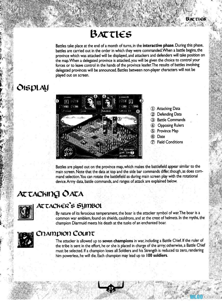 在正式开始游戏之前,你必须先从9位领主当中选择一个中意的角色。每位 领主各有不同的属性、本领、气质、技能,拥有数量不等的领地和勇士;他们都为统 一爱尔兰的梦想而奋斗,因而都在尽力搜集所有的符咒魔法,以便达到最高统治者的 地位。他们是: