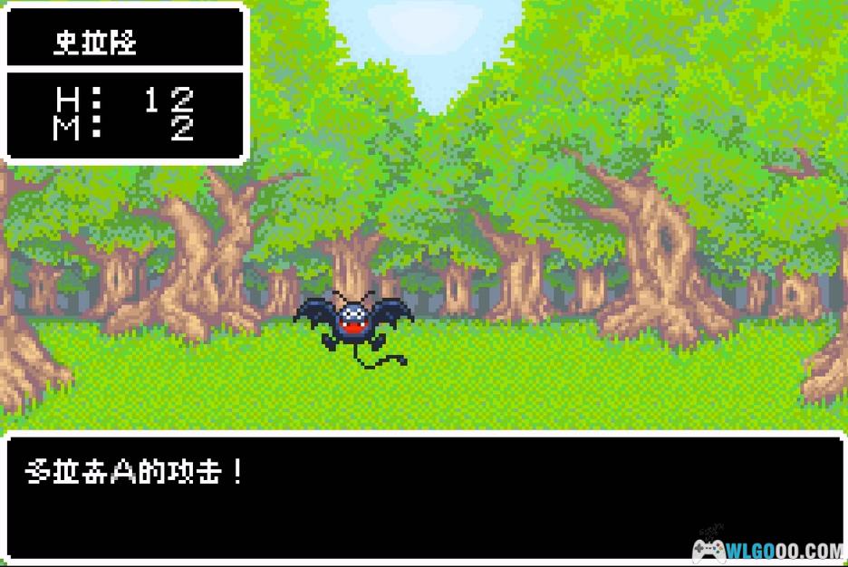 主角被传送到一处森林,往左走遇上一群人,先与蓝色的史莱姆对话,选头一项,然后再与男孩身后的三个人对话,接着再与蓝色的史莱姆对话一次。接下来就是头一场战斗了。对手是两只蝙蝠,对手的HP只有5,两个回合搞定。胜利后面对问题还是选头一个。干掉森林里剩下的6只蝙蝠后,从森林的最南面出来。