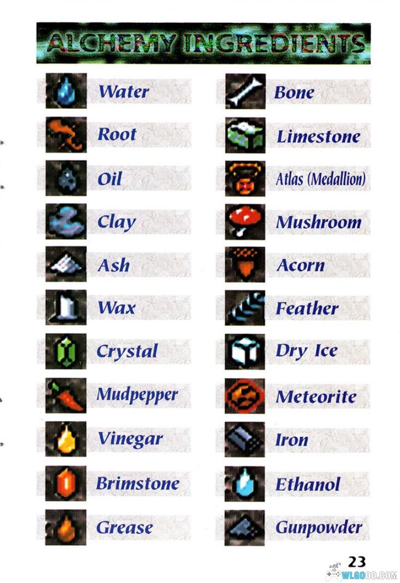 | 酸雨 | 1 份灰,3 份水 | 击败斯拉克克斯后,从那里往前走一点,走出臭泥地区后贴着右墙走。最终你会走进一条隐藏通道。往右走,和炼金术士交谈学习酸雨 | 这是一个进攻性攻击法术,释放酸雨攻击敌人 |