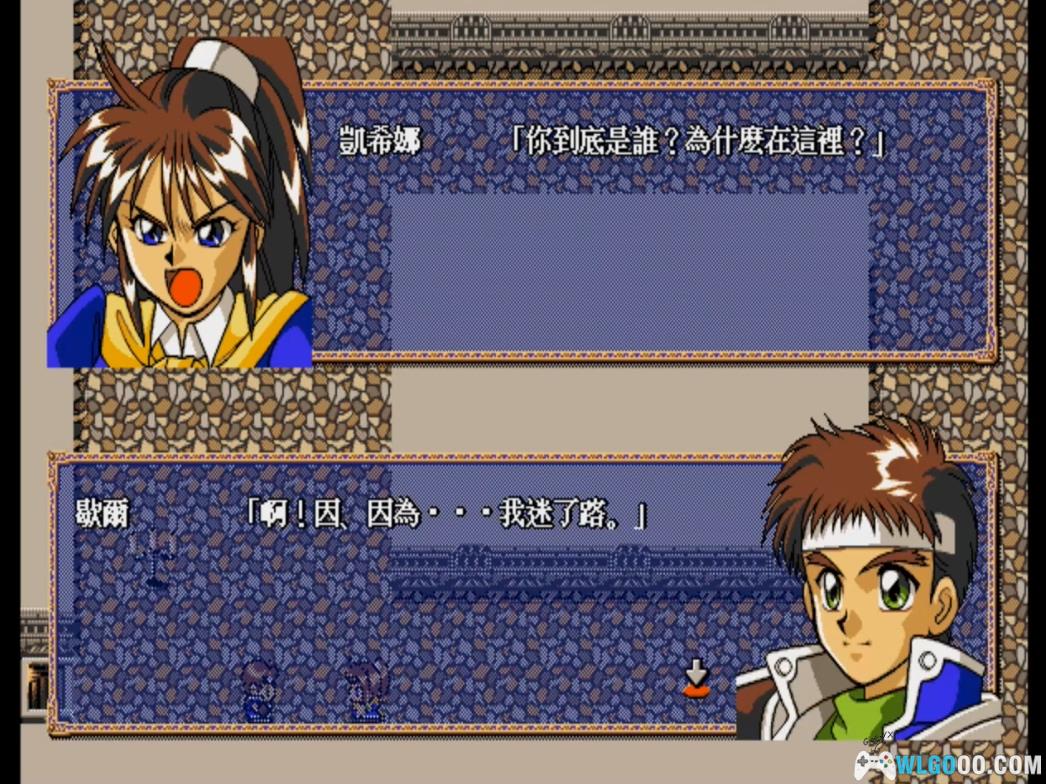 (这一关地势比较开阔,魔军也较多,最好队员们一起行动,战斗中要及时利用凯希娜的治疗术给队员们加血,当打到某一回合时,众人会自动在城镇是住宿,凯希娜莫明地做了一个可怖的怪梦,隐约好象是童年的事。然后往北过小桥,先往西北,打败八只史莱姆可在林中枯树下找到隐藏的宝箱,得到龙舌酒,以它可以使死去的队员复活。接着往东北过小桥杀掉五名骑士和小鬼,进入到一个小城堡中。)