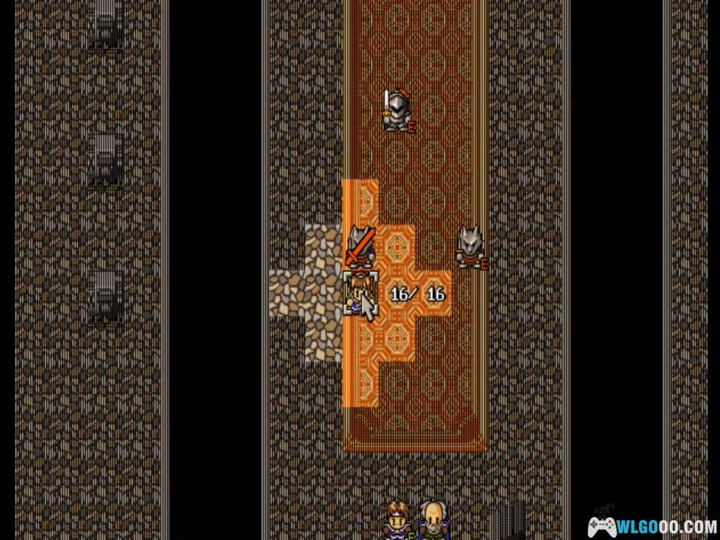 (这一关的敌人又高出一个等级,从地势来讲还是少入宝库开宝箱为妙,因为那样会得不抵失的,只要聚成一处往左上角杀过去就成了,如果动作快的话,趁敌人还没有行成包围之势入可以突过去了,只要走到那扇门前就算过关了。)