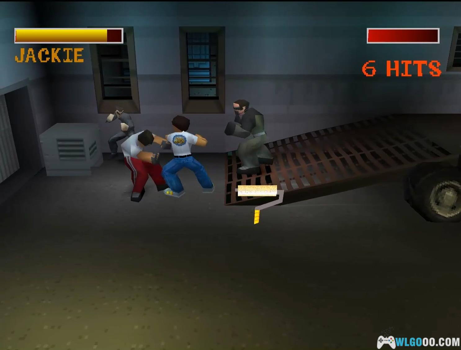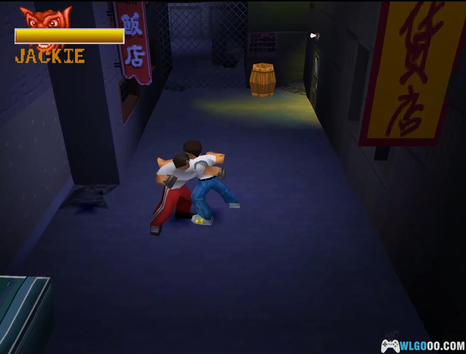 沿消防梯下到地面(若在平台处掉落,可解决此处敌人并打破最左侧木桶获取第五个龙首,然后向右走)。看到阳台后,用墙壁跳跃上去,再用一次墙壁跳跃到上方阳台,获取两个龙首。随后进入小巷追逐逃跑的敌人,触发成龙躲避卡车的 FMV 动画。恢复控制后,朝着屏幕方向奔跑,绕过箱子不要错过第六个龙首,最后跳过围栏。